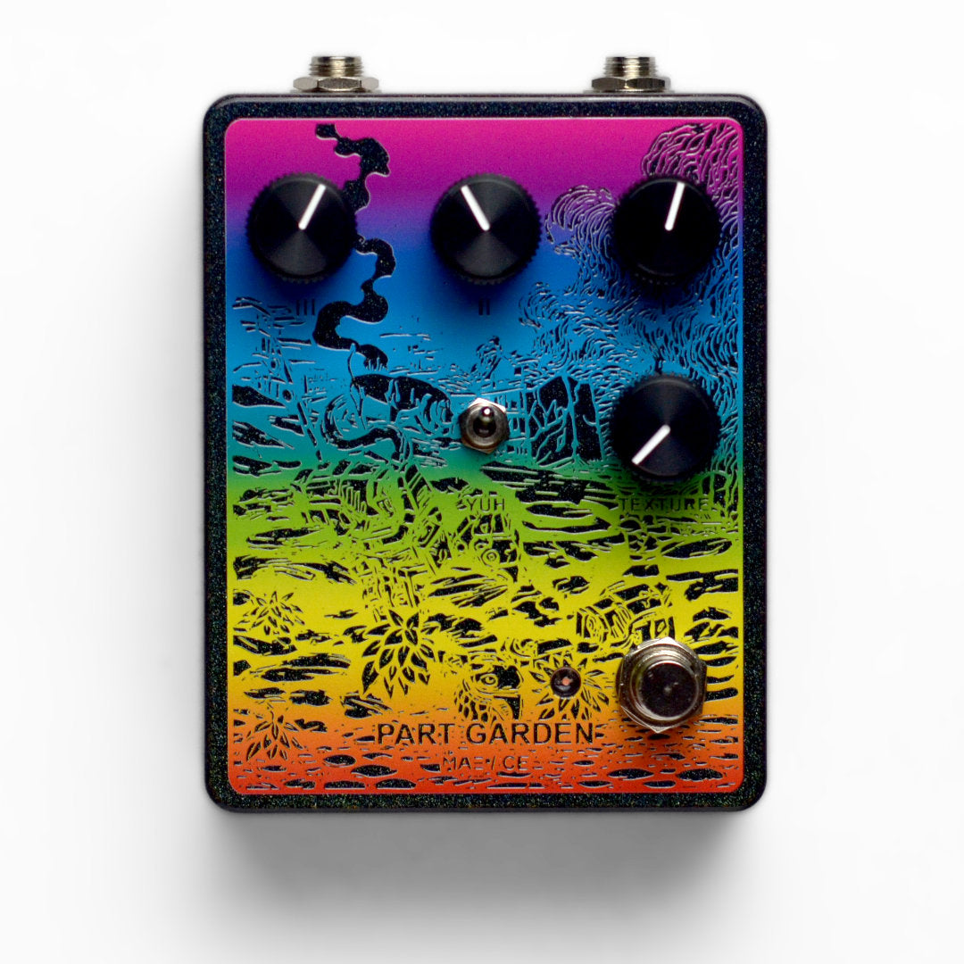 Part Garden grew from the idea of stacking fuzz pedals. It's essentially two fuzzes within one pedal, with both tuned to bring out the best of the other. We spent a long time trying to find the perfect, versatile combination, with the ability to work as a smooth overdrive, a wild fuzz, and anything in between. The first fuzz is fairly warm and the second is harmonically rich, though this will change as you adjust the controls. This is a very dynamic pedal, so be sure to use your volume control to get even more range out of it.